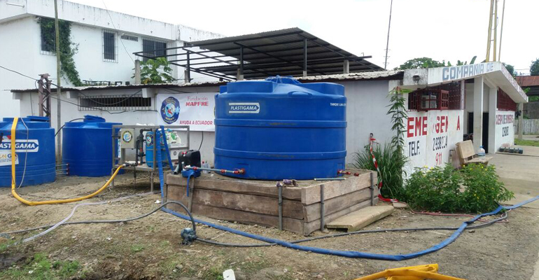 El pasado mes de abril, la ONG Bomberos en Acción partió a Ecuador con dos plantas potabilizadoras móviles de Dinotec, (una PP 4X4 y una PP4x4 Dual) y 5 bomberos de las delegaciones de Murcia y Málaga para trabajar potabilizando y abasteciendo de agua a la población, todo ello posible con el patrocinio de Fundación Mapfre.